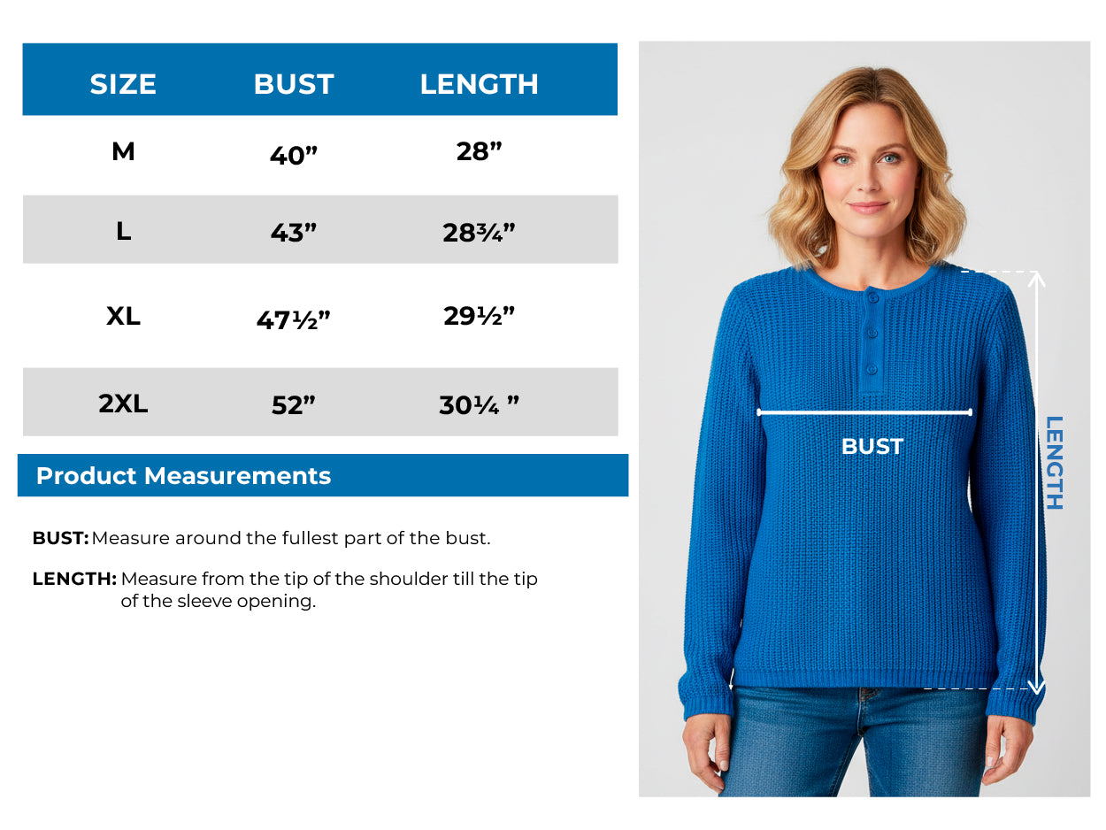 Choose comfort and style with this Henley shaker-knit sweater for women that is a must-have for your winter wardrobe. Soft, textured and durable 100% knit acrylic meets a timeless 3-button Henley placket, blending relaxed charm with polished versatility. The long sleeves are here to layer up for a chilly morning coffee run or heading out for a casual dinner. The length is flattering and easy to pair with jeans, leggings, or your favorite skirt. Perfect for those who want a “knit sweater women” look that bridges laid-back comfort and everyday elegance. The relaxed fit style transitions smoothly from a cozy at-home piece to a stylish choice for weekend outings.