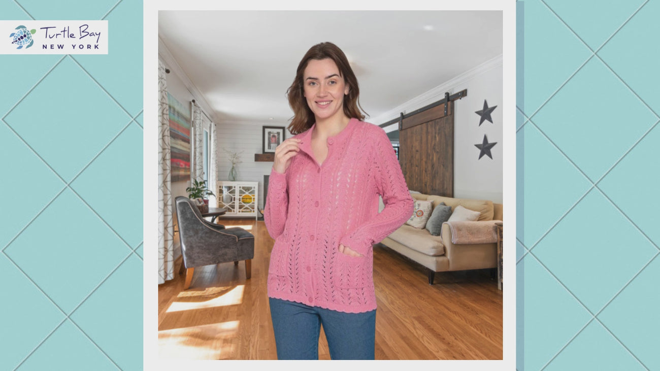 - Detailing : hand-designed pointelle knit, color-matched pearlized buttons, scalloped sleeves, two front patch pockets and hem.