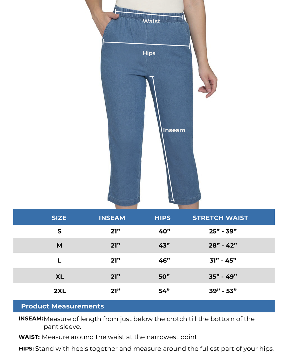 Elastic Waist and Straight Leg : The stretch denim capri has an elastic waistband for easy pull on/off and straight leg with 21" inseam gives a smooth tapered fit.